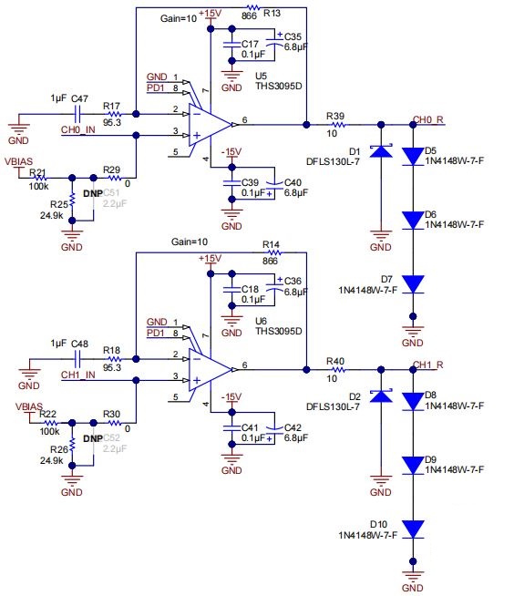 猜测是Driver Stage(电阻匹配10倍放大)的大电压导致了U5和U6的过电流,是否正确?请问C51和C52的作用是什么?参考电路中不接这两个电容,为什么实际使用中会发生过电流的问题?想请教应该如果修改电路,使其能放大OUT信号,并且能接收IN信号?